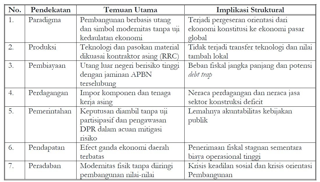 Menurut analis ekonomi politik penulis, proyek semacam ini tidak cukup dinilai hanya dari sisi ekonomi finansial. Ia menekankan perlunya pembacaan yang lebih mendalam melalui tiga pendekatan berlapis, yaitu: