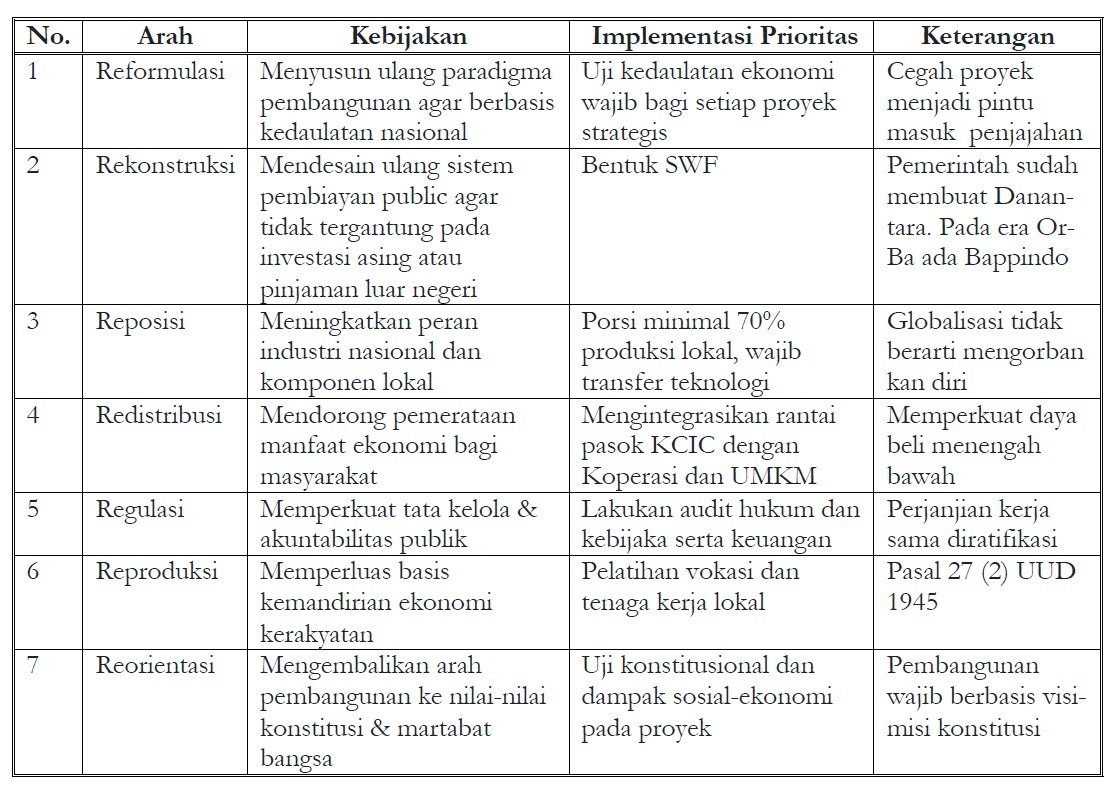 Melalui pendekatan tersebut, audit terhadap proyek KCIC tidak hanya berhenti pada hitung-hitungan untung rugi, tetapi juga menjadi jalan untuk menemukan penyelesaian struktural yang sesuai dengan prinsip konstitusional ekonomi Indonesia.