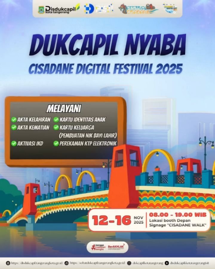 Kepala Disdukcapil Kota Tangerang Dr. R. Rizal Ridolloh, S.Sos., M.Si., mengatakan melalui Dukcapil Nyaba CDF 2025 masyarakat Kota Tangerang dapat mengakses sejumlah layanan adminduk dengan mudah, cepat, dan gratis. Layanan adminduk dibuka pada pukul 08:00 WIB sampai dengan pukul 19:00 WIB.
