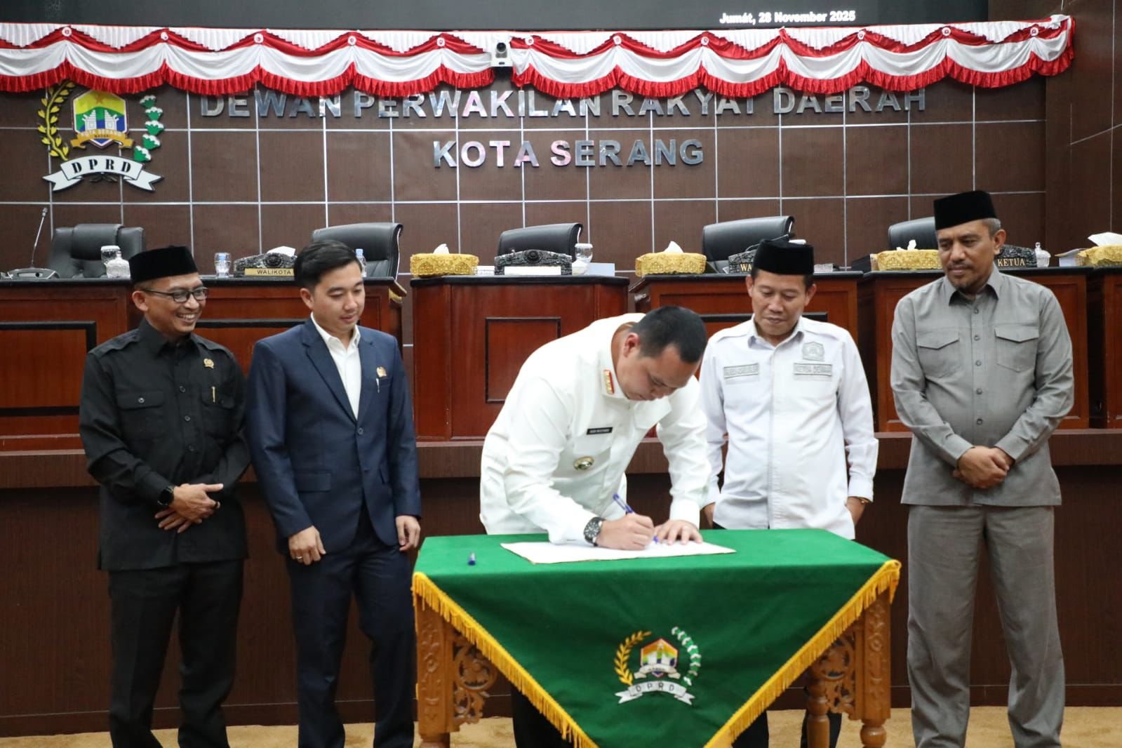 Kesepakatan ini ditandai dengan penandatanganan yang dilakukan oleh Wali Kota Serang Budi Rustandi bersama Ketua DPRD Kota Serang Muji Rohman dalam Rapat Paripurna, Jumat (28/11/2025), dan turut disaksikan para anggota dewan serta tamu undangan.