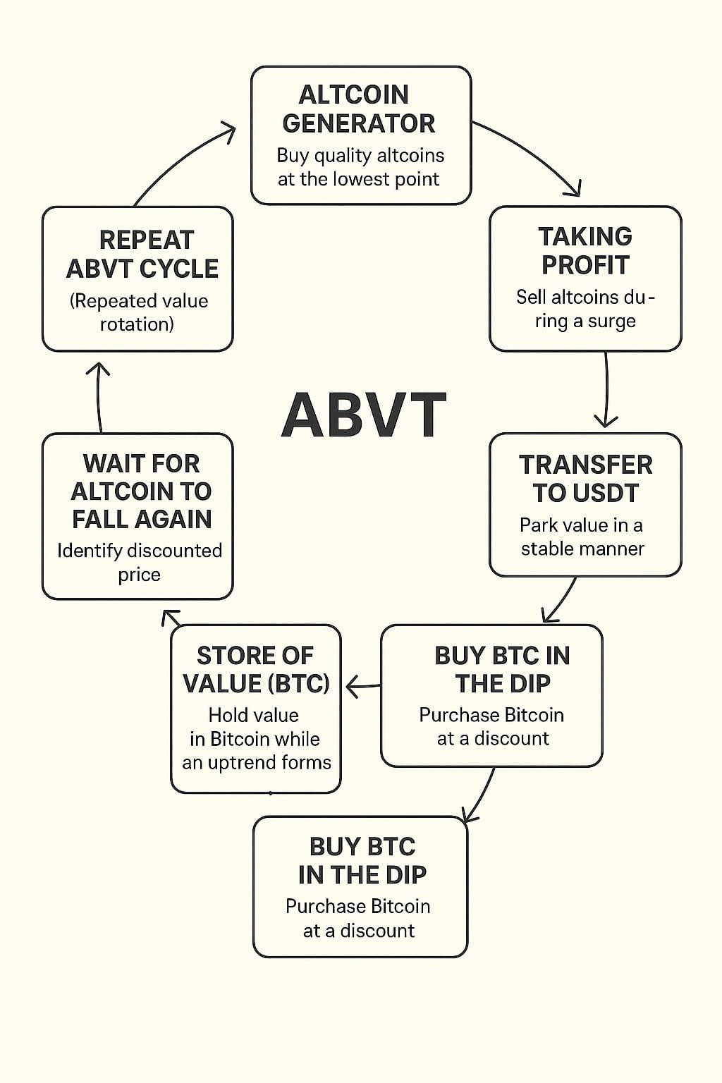 ABVT (Altcoin–Bitcoin Value Transfer) adalah strategi rotasi nilai yang dirancang untuk memanfaatkan siklus pasar kripto secara sistematis. Mekanismenya sederhana namun cerdas: