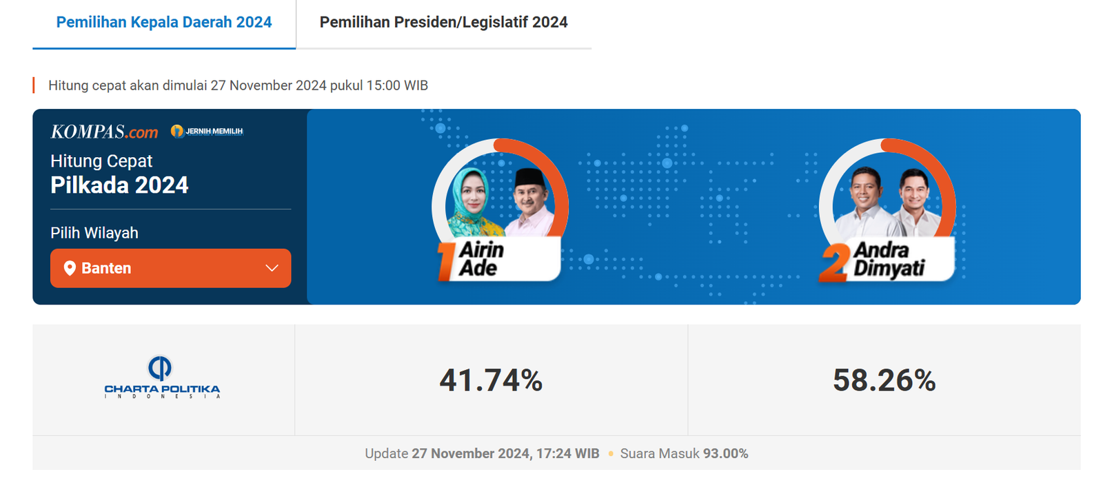Hasil perhitungan cepat Pilkada Banten oleh Litbang Kompas hingga pukul 17.24 WIB. (Foto: Tangkapan layar oleh TangerangDaily)