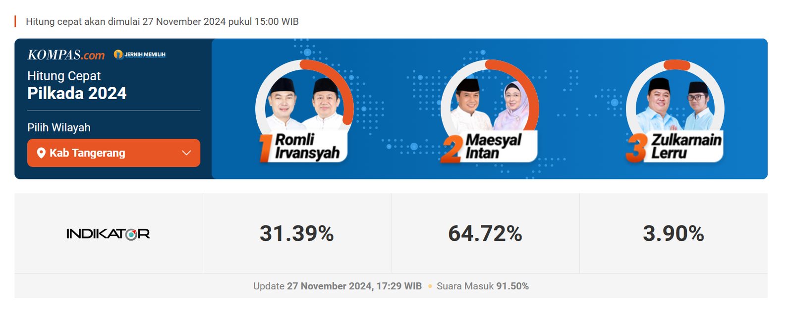Sementara untuk Pilkada Kabupaten Tangerang, hasil hitung cepat hingga pukul 17.29 WIB, paslon Maeyal Rasyid-Intan Nurul Hikmah unggul dengan perolehan 64.72%, kemudian Mad Romli-Irvansyah 31.39%, terakhir paslon Zulkarnain-Lerru 3.90%. Suara Masuk 91.50%.