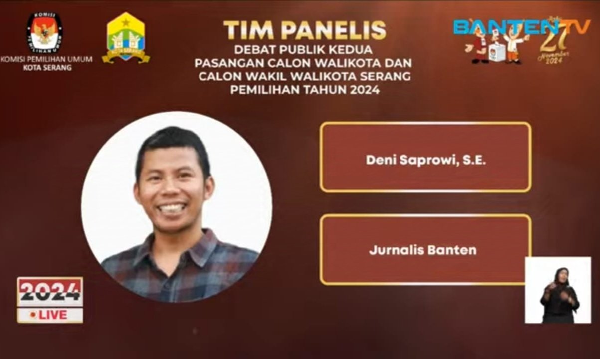 KOTA SERANG – Jurnalis Banten sekaligus Ketua Kelompok Kerja (Pokja) Wartawan Harian dan Elektronik Provinsi Banten Deni Saprowi atau biasa dikenal bung Saprol menjadi panelis pada debat kedua Calon Walikota dan Wakil Walikota Serang di Pilkada Kota Serang yang diselenggarakan KPU dan disiarkan langsung pada kanal Youtube KPU Kota Serang, Banten TV dan sejumlah media yang bekerjasama, Selasa (12/11/2024) malam.