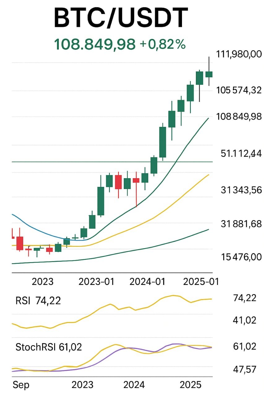 Grafik candle bulanan menunjukkan bahwa Bitcoin telah mengalami reli kuat sejak menyentuh titik bawah di sekitar $15.500 pada akhir 2022, hingga mencapai puncak lokal di $111.980 pada pertengahan tahun 2025. Lonjakan harga ini mencerminkan fase ekspansi pasca-halving yang berjalan secara bertahap dan bukan vertikal.