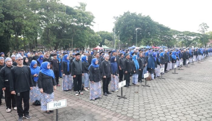 KOTA SERANG – Ribuan Aparatur Sipil Negara (ASN) di lingkungan Pemerintah Kota Serang kompak mengenakan seragam batik dan pangsi saat mengikuti upacara peringatan Hari Ibu ke-97 tingkat Kota Serang di Alun-alun Kota Serang, Selasa (22/12/2025).