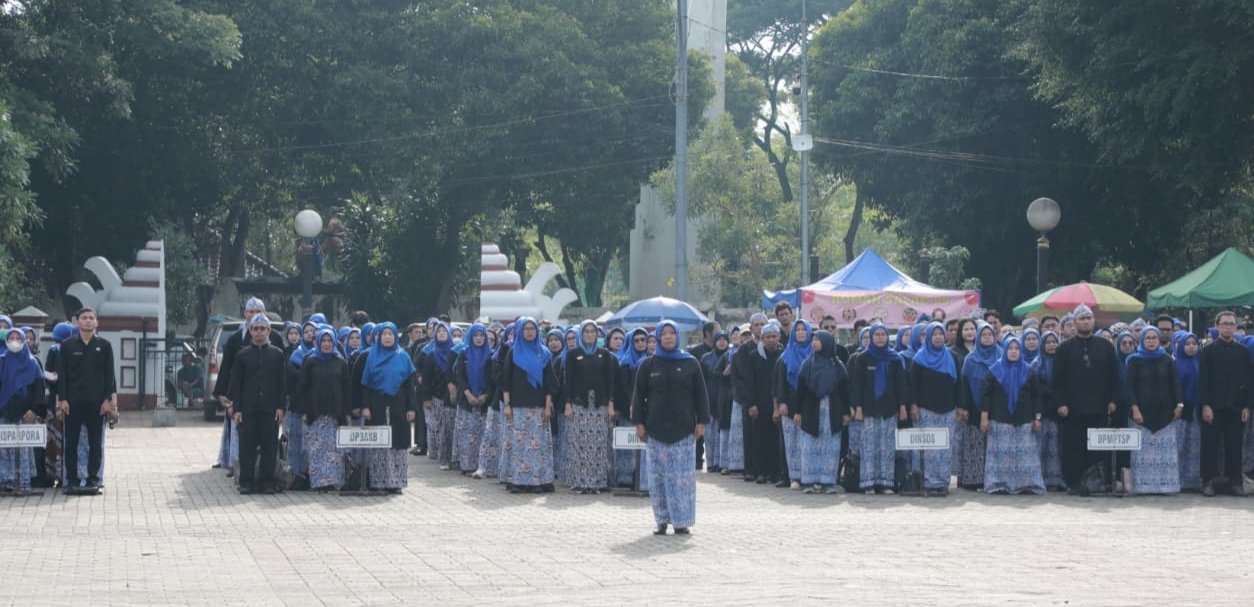 Para ASN terlihat berbaris rapi dan tertib. ASN perempuan mengenakan atasan hitam dsn bawahan bermotif batik, sementara ASN laki-laki tampil dengan pakaian adat pangsi serba hitam.