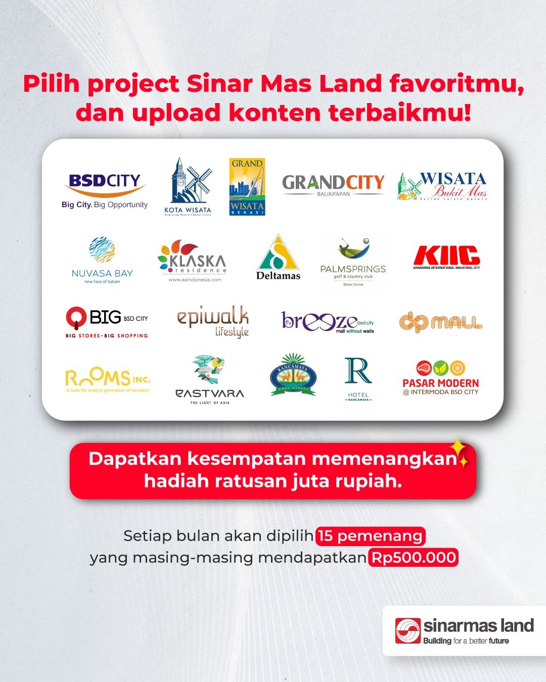 “Dari kawasan hunian modern, perkantoran inovatif, pusat edukasi, hingga ruang publik yang mendukung gaya hidup urban, kompetisi ini juga merupakan bentuk apresiasi kami kepada para content creator yang telah menghasilkan konten positif tentang proyek-proyek Sinar Mas Land di seluruh Indonesia,” imbuhnya.