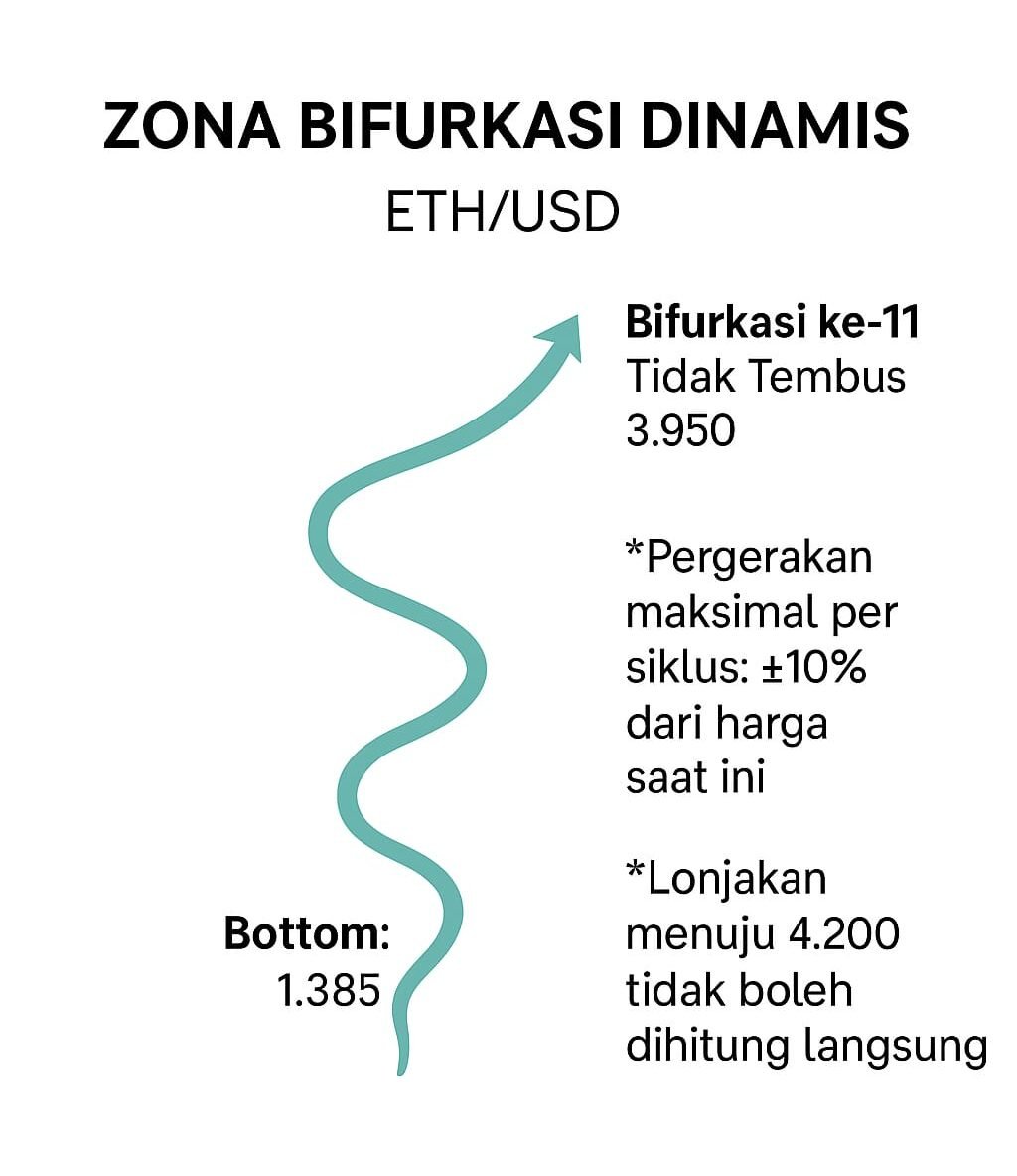 Ketika Ethereum mendekati angka psikologis $4000, DZB memberi kita peringatan penting: level ini bukan hanya resistensi teknikal, tetapi juga merupakan titik bifurkasi ke-12 yang akan menentukan kelanjutan atau kegagalan tren naik. Jika ETH menembus 3950 secara meyakinkan (zona bifurkasi akhir sebelum 4000), maka lonjakan menuju 4200 bukanlah spekulasi, melainkan kelanjutan dari siklus DZB yang telah konsisten.