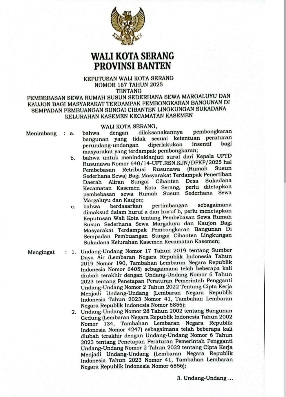 “Mumutuskan pembebasan sewa/retribusi sebagaimana dimaksud pada Diktum kesatu bagi masyarakat Lingkungan Sukada Kelurahan Kasemen yang terdampak pembongkaran dan direlokasi ke Rusunawa. Pembebasan sewa selama satu tahun mulai Juli 2025 hingga 30 Juni 2026,” tulis dalam Kepwal tersebut.