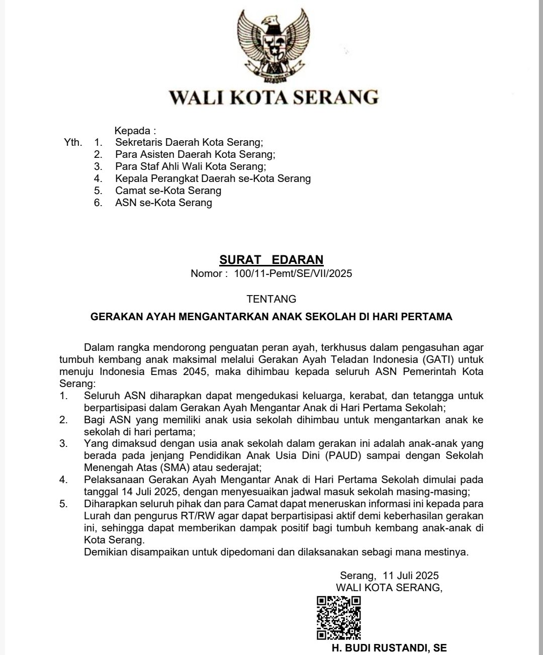 KOTA SERANG – Walikota Serang Budi Rustandi menerbitkan Surat Edaran (SE) nomor 10011-Pemt/SE/VII/2025 tentang gerakan ayah mengantarkan anak sekolah dihari pertama sekolah yang ditandatanganinya tanggal 11 Juli 2025 kemarin.